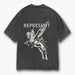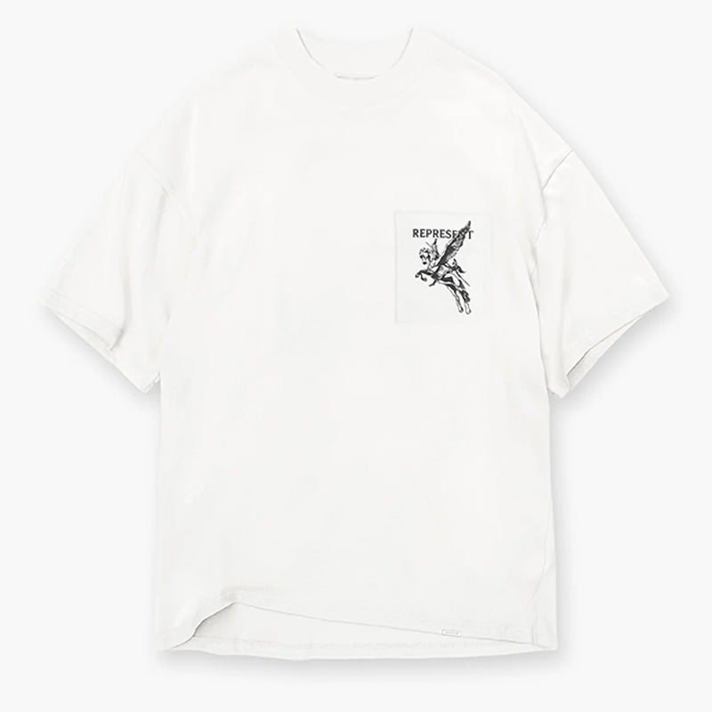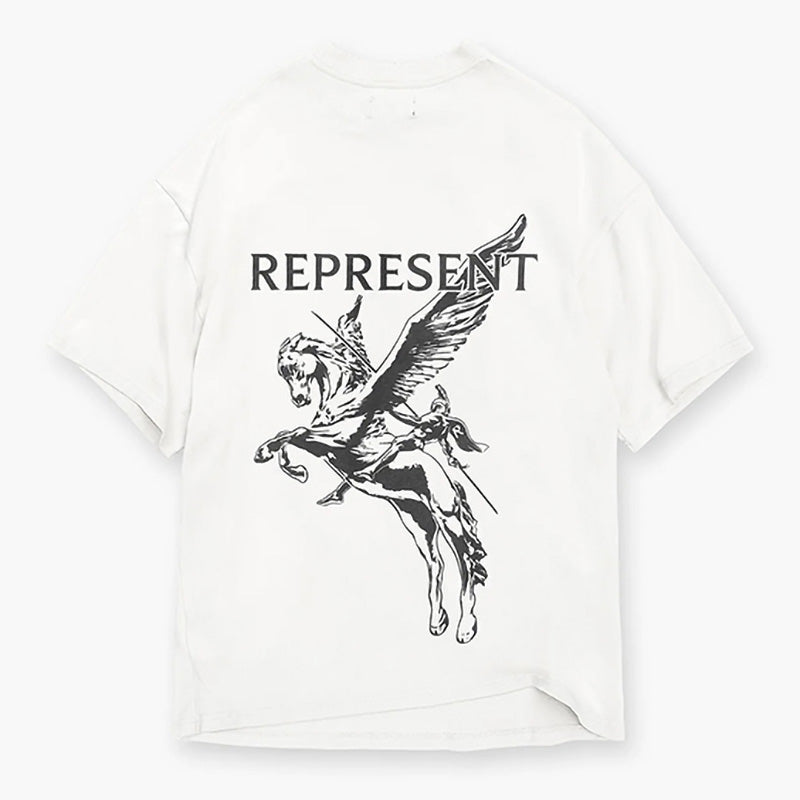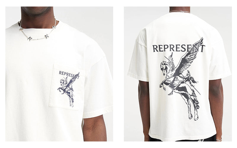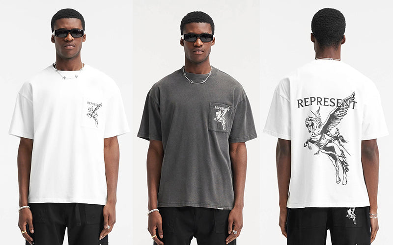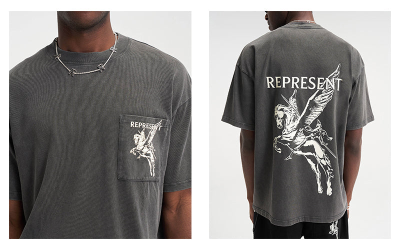 The Mascot T-Shirt in Vintage Grey is crafted from luxury medium weight cotton, It features our tonal puff detailed Bellerophon graphic to the front pocket and to the back of the tee, with a Represent metal bar to the hem.